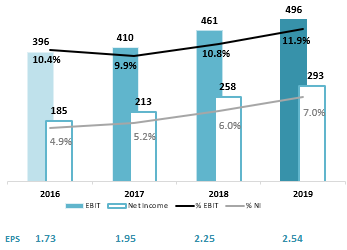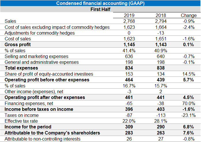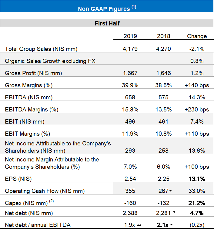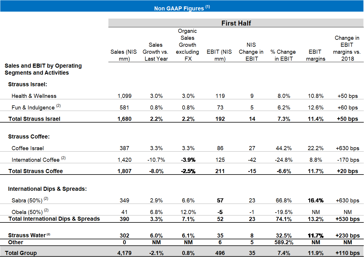 In the first half-year, the Group’s revenue amounted to NIS 4.18 billion, reflecting 0.8% organic growth excluding foreign currency effects; gross profit was NIS 1.67 billion – 39.9% of sales compared to 38.5% of sales in the corresponding period. The EBIT in the half-year was NIS 496 million, 11.9% of sales, reflecting an improvement of 7.4% compared to the corresponding period last year. Strauss Group’s net profit was NIS 293 million, an improvement of 13.6% compared to the net profit in the first half of 2018.