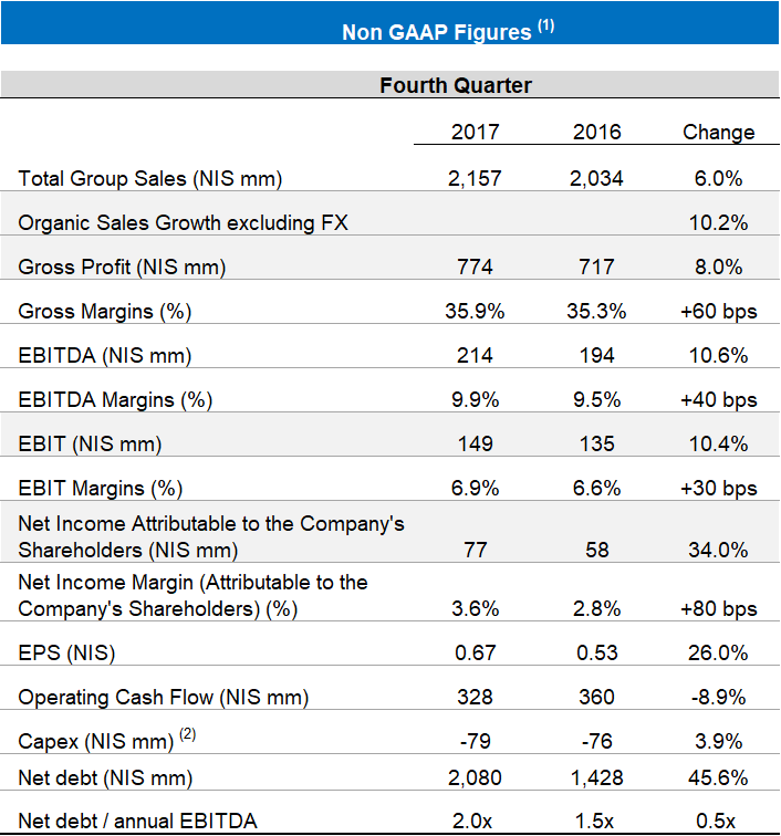 - Organic sales growth, excluding foreign currency effects, was c10.2%. Shekel sales were NIS c2.2 billion compared to NIS 2 billion in the corresponding period last year, and include a NIS c53 million negative translation effect as a result of the weakening of the Brazilian Real versus the NIS.