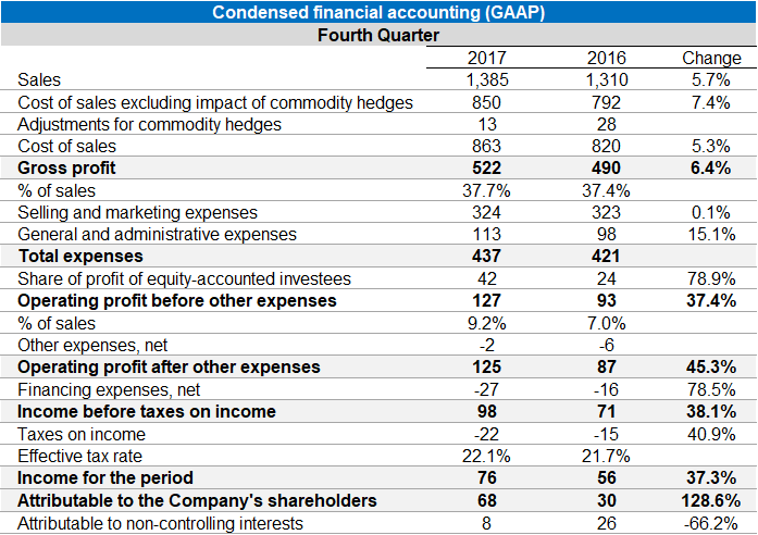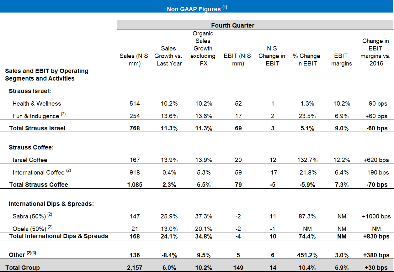 Gadi Lesin, President and CEO of Strauss Group (March 14, 2018): “Strauss Group continues to present solid results in all key parameters. In the fourth quarter of 2017 sales grew a stellar 10.2% excluding FX translation, and net income rose by 34%. These excellent results were attained, among other things, by implementing strategic moves which enhanced the Group’s operational and managerial flexibility whilst focusing on core assets, by increasing our investment in innovation, signing new distribution agreements and expanding our geographical reach. Alongside the strong performance of Strauss Israel, Strauss Coffee and Strauss Water, 2017 was a challenging year for Sabra, our dips and spreads business in North America, which nevertheless succeeded in returning to close to pre-recall selling and market share levels”.