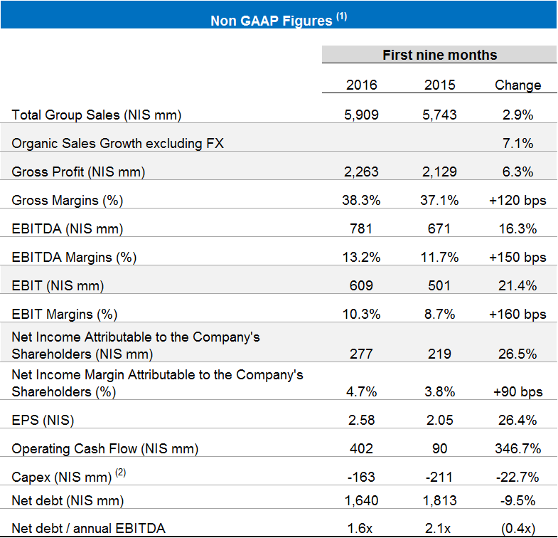 Strauss Group announces a strong third quarter with 5.8% organic sales growth and NIS 213 million non-GAAP EBIT, an 11.2% growth rate. In the first nine months of 2016 sales grew organically a significant 7.1% and EBIT increased substantially to NIS 609 million, a stellar 21.4% growth rate (1)