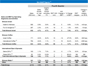 - Fun & Indulgence figures include Strauss’s 50% share in the salty snacks business. International Coffee figures include Strauss’s 50% share in the Três Corações joint venture (3C) – Brazil – a company jointly held by the Group (50%) and by the local São Miguel Group (50%). International Dips & Spreads figures reflect Strauss’s 50% share in Sabra and Obela. Strauss Water EBIT figures include Strauss’s share in Haier Strauss Water (HSW) in China (49%).