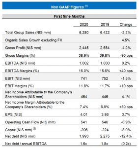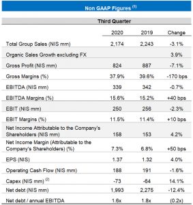 The Group’s Q3 sales totaled NIS 2.17 billion, reflecting 3.9% organic growth excluding foreign currency effects