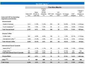 - Fun & Indulgence figures include Strauss’s 50% share in the salty snacks business. International Coffee figures include Strauss’s 50% share in the Três Corações joint venture (3C) – Brazil – a company jointly held by the Group (50%) and by the local São Miguel Group (50%). International Dips & Spreads figures reflect Strauss’s 50% share in Sabra and Obela. Strauss Water EBIT figures include Strauss’s share in Haier Strauss Water (HSW) in China (49%).